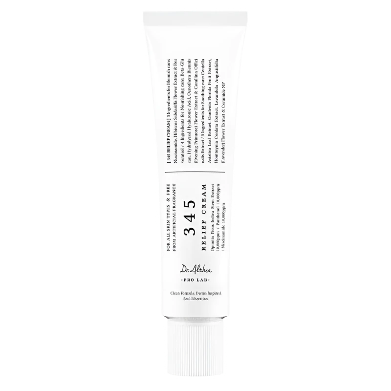 La Dr. Althea 345 Relief Cream est une crème apaisante et hydratante spécialement formulée pour les peaux sensibles et réactives. Grâce à sa combinaison unique de 3 céramides, 4 types d’acide hyaluronique et 5 types de peptides, elle renforce la barrière cutanée, retient l’hydratation et favorise la régénération de la peau.